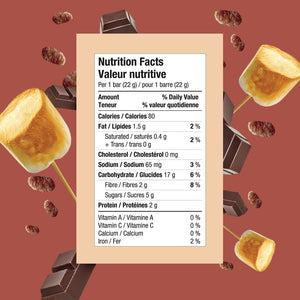 Brown rice, Tapioca fibre, Chicory root fibre, Semi-sweet chocolate chips (sugar, chocolate paste, cocoa butter), Sunflower oil, Vegetable Glycerin, Cocoa powder, Natural flavour, Rice syrup, Salt, Fruit and vegetable blend (apple, onion, broccoli, kale, cranberry, raspberry), Agar, Chickpea.